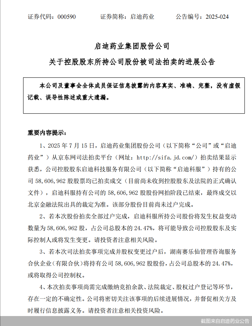 107次延时,138轮竞价。近期,成立仅一个月的湖南赛乐仙管理咨询服务合伙企业(有限合伙)(以下简称“湖南赛乐仙”),以10.07亿元的高价击退7名对手,在拍卖场上夺得启迪药业(000590)24.47%股权,也成为启迪药业的潜在新主。